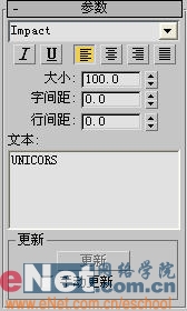 2、展開“參數”卷展欄,修改大小、字型、文字信息等參數,如圖1所示。在前面視圖區中單擊鼠標左鍵,加入文字text01,如圖2所示。