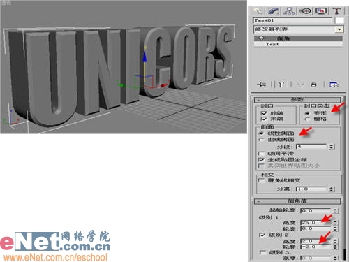 3、選中文字text01,單擊“修改”命令面板,在修改器列表中選擇“倒角”項并進入其屬性面板,在參數卷展欄中勾選“封口”欄下各項,確定封口類型等參數,修改倒角值欄下的級別1、級別2的高度與輪廓值等參數,最終形成的效果如圖3所示。