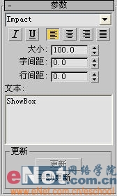 2、展開“參數”卷展欄,在下拉列表中選擇一種字體,調整大小、字型、行距、文字信息等參數,輸入所要的文字,如圖1所示。在前面視圖區中單擊鼠標左鍵,加入文字text01,如圖2所示。