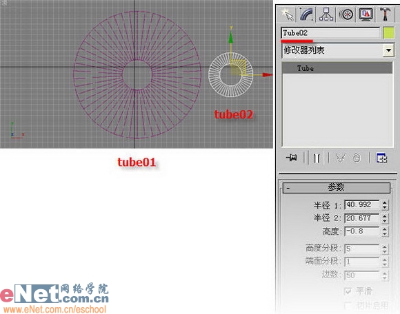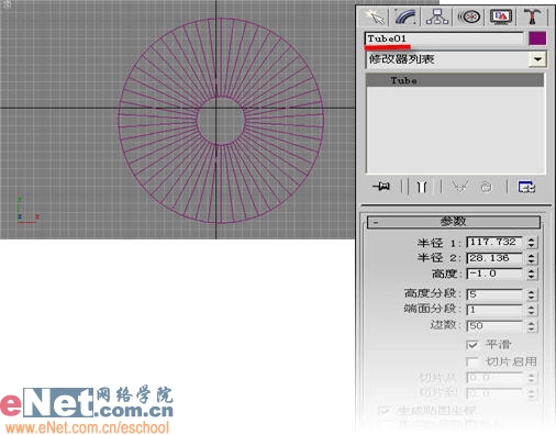 1、啟動3dmax9.0,單擊“創建”命令面板,點擊“幾何體”按鈕,在下拉列表框中選擇“標準基本體”項。單擊“管狀體”按鈕,在頂部視圖中新建一個圓管tube01,并適當調整其參數。如圖1所示。