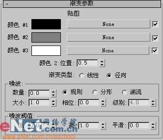 5、點擊“轉到父對象”按鈕回到上級目錄,點擊“遮罩”后面none按鈕,打開“材質/貼圖瀏覽器”面板,選擇“新建”單選項,然后在左邊列表中雙擊“漸變”貼圖并進入其屬性面板。展開“漸變參數”卷展欄,并修改其參數,如圖7所示。