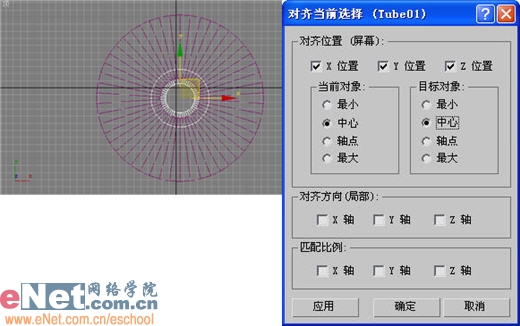 3、選中tube02,單擊工具欄上的“對齊”按鈕,再視圖中選擇tube01,在彈出的“對齊當前選項”窗口中,修改其參數,單擊“確定”即可。此時的tube01、tube02在坐標軸上為中心對稱了,如圖3所示。
