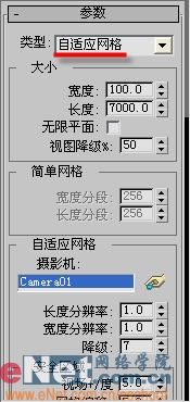 7、選中海面01,進入“修改”命令面板,打開“參數”卷展欄,修改類型項、大小尺寸、長度/寬度分辨率等值,并在“自適應網格”控制夾下點擊“拾取攝影機”按鈕拾取場景中的camera01,如圖9所示。