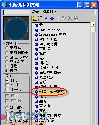 1、點擊工具欄上的“材質編輯器”按鈕,打開其面板,點擊“獲取材質”按鈕,打開“材質/貼圖瀏覽器”窗口,在列表中雙擊“幻景:海浪材質”項,如圖3所示。