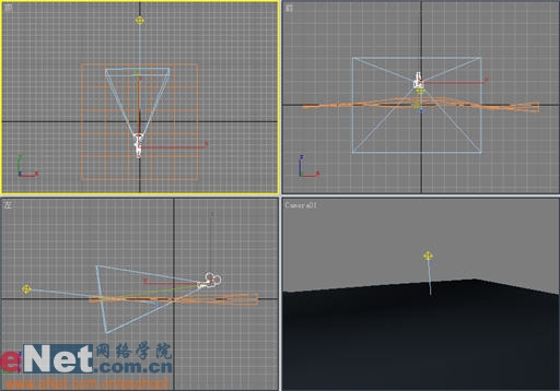 2、點擊“創建”命令面板,選擇“燈光”按鈕,在其下拉列表中選中“幻景”項,單擊“對象類型”卷展欄下的“太陽”按鈕,在頂部視圖中添加一太陽01,再按ctrl+c添置一攝影機,并通過其他視圖調整它們的位置,如圖2所示。