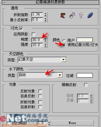 5、打開材質編輯器,調整“幻景海浪材質參數”卷展欄下的“閃光銳度”、顏色選項、水下顏色類型等定義,如圖7所示。