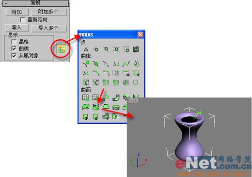 8、通過“創建”命令面板中的“圖形”,點擊“圓”按鈕,繪制一個圓,作為杯把的截面線,并打開“修改”面板,通過“nurbs曲面”級別下“常規”卷展欄中的“附加”按鈕添加到nurbs曲面中方便編輯。