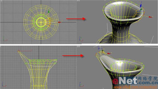 小提示:為了整體的美觀和諧,利用移動或縮放工具按鈕可以在“修改”面板中對“nurbs曲面”再作瓶子形體的調整。