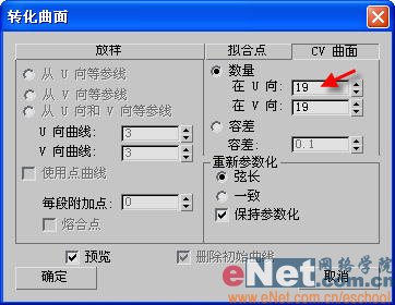 小提示:用移動工具可以輕松移動曲面cv上的cv點,實時看到實體的變化。點擊“曲面”項,打開“曲面公用”卷展欄,點擊“轉化曲面”按鈕可以通過數量值來修改曲面上的點的個數,如圖7所示。