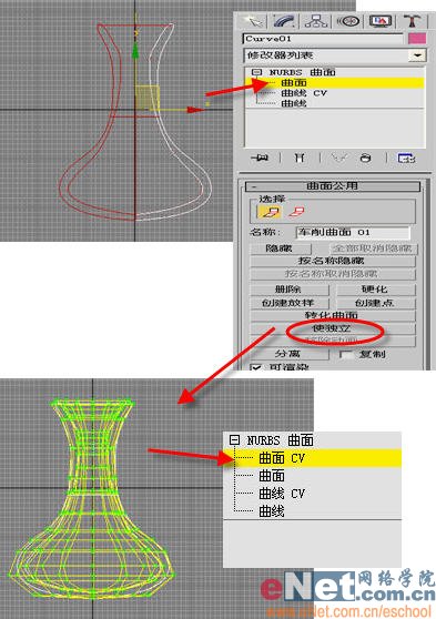 5、點擊“nurbs曲面”下的“曲面”項,打開“曲面公用”卷展欄,點擊“使獨立”按鈕,獨立出“曲面cv”,對曲面再作些調整,如圖6所示。