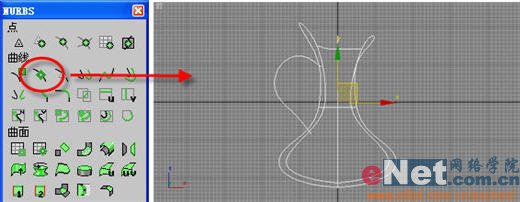 2、單擊“修改”命令面板,在“常規”卷展欄下點擊“nurbs創建工具箱”按鈕,調出工具窗口,點擊“創建車削曲線”按鈕,并點擊視圖中的curve01,形成實體圖,如圖2所示。