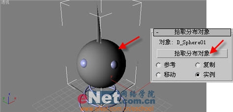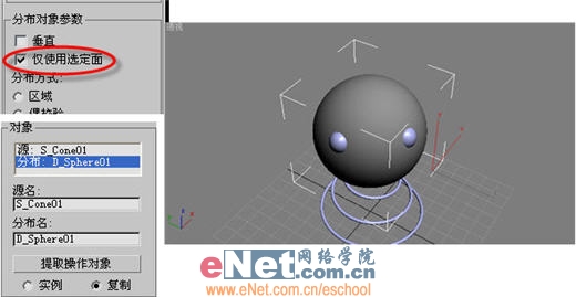 4、調整頭發在頭部的位置,勾選“散布對象”卷展欄中的“分布對象參數”的“僅使用選定面”復選框,并點中“對象”欄下的“分布:d_sphere01”項,視圖中如圖6所示。