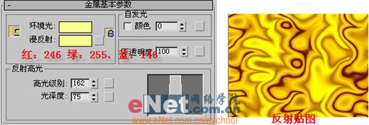 1、點擊工具欄上的“材質編輯器”按鈕,打開其面板,選擇第一個樣球,打開“貼圖”卷展欄,單擊“反射”后的“none”按鈕,打開“材質/貼圖瀏覽器”面板,選擇“新建”單選項,然后在左邊列表中雙擊“位圖”貼圖,為其指定一個金屬圖片,打開“金屬基本參數”卷展欄修改其參數,如圖11所示。