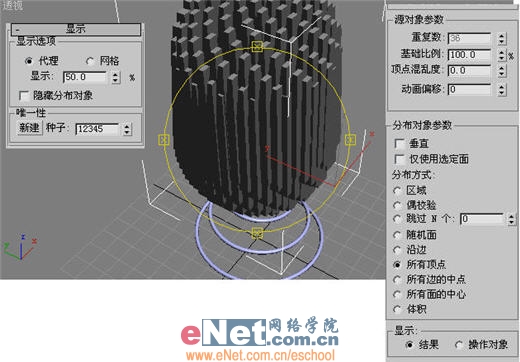 3、點擊“源對象參數”欄下的“重復數”值可以調整頭發的數目,定義分布方式,為了顯示的更加迅速可以選擇代理顯示,調整為50%,但在渲染時并不會減少計算,只是為了在視圖操作時更加的靈活,如圖5所示。