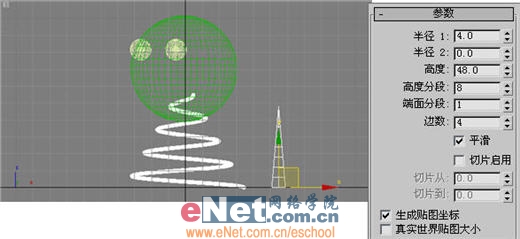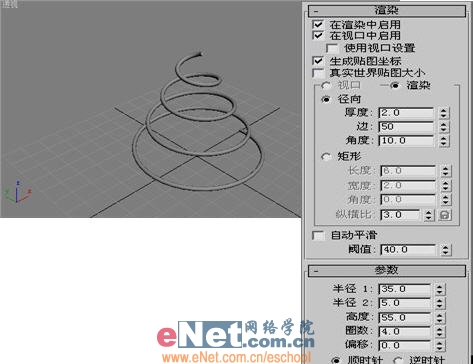 1、啟動3dmax9.0,點擊“創建”命令面板中的“圖形”按鈕,單擊“螺旋線”工具按鈕,在頂部視圖中拖動鼠標繪制一螺旋線helix01,并通過“修改”命令面板修改其參數,如圖1所示。
