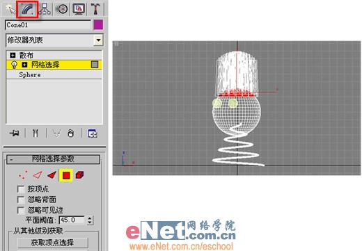 5、在“修改”面板中,點中sphere項,在“修改器列表”中選擇“網格選擇”項,單擊“網絡選擇參數”卷展欄下的“多邊形”按鈕,在視圖中拖拽出頭發應在的位置,如圖7所示。
