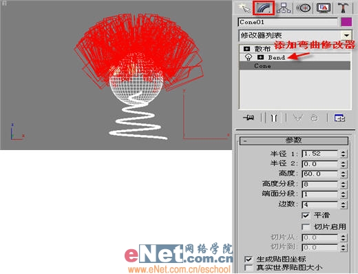 7、繼續在修改中選中“散布”,點中“對象”欄下的“源:s_cone01”項,然后就可以進入頭發cone的修改了,調整“參數”卷展欄下的半徑1、高度、邊數、分段的值,使得在渲染時更加的快速。同時在“修改器列表”中選擇“彎曲”項,并調整其角度參數為70,如圖9所示。