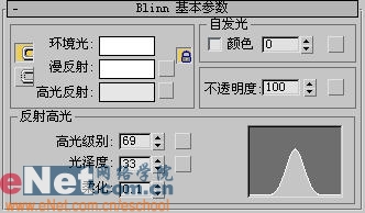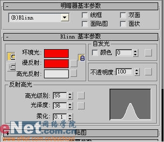 1、點擊工具欄上的“材質(zhì)編輯器”按鈕,打開其面板,選擇第一個樣球,修改“blinn基本參數(shù)”中的環(huán)境光、漫反射、高光反射等參數(shù),如圖11所示。將第一個樣球材質(zhì)賦予arc02。