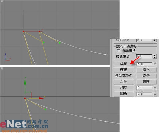 6、再次點擊“連接”按鈕,取消當前連接選擇狀態(tài),然后在視圖中選擇arc01與arc02的兩個頂點,單擊“幾何體”卷展欄中的“焊接”按鈕,將兩個頂點焊接為一個頂點,如圖5所示。