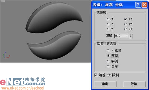 9、選擇arc01,單擊工具欄上的“鏡像”按鈕,調(diào)出參數(shù)窗口,確定后兩個月牙形成,如圖8所示。