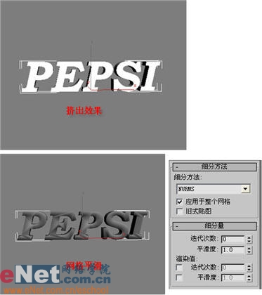 11、選中text01,進入“修改”命令面板,在“修改器列表”中選擇“擠出”項,得到立體文字。繼續(xù)在“修改器列表”中選擇“網(wǎng)格平滑”項,修改其參數(shù),效果如圖10所示。
