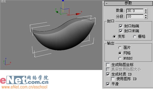 8、選中arc01,進入“修改”命令面板,在“修改器列表”下拉框中選擇“擠出”項,并進入其參數(shù)卷展欄,修改相關(guān)參數(shù),得到效果如圖7所示。