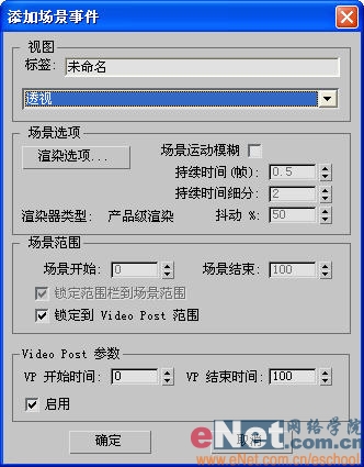 4、點擊“渲染”菜單中的“video post”命令,打開其視頻合成器窗口,點擊“添加場景事件”按鈕,在“視圖”欄下選擇“透視”項,單擊確定,如圖9所示。