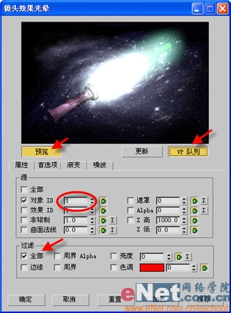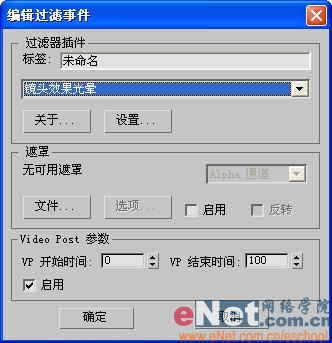 6、雙擊“video post”窗口中的“鏡頭效果光暈”項,打開過濾事件窗口,點擊“設置”按鈕,打開鏡頭效果高光窗口,修改對象id值等定義,如圖11所示。