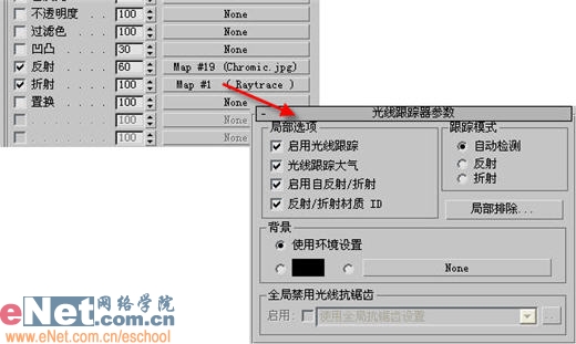 4、單擊“轉(zhuǎn)到父對(duì)象”按鈕,回到上級(jí)目錄,在“貼圖”卷展欄中,點(diǎn)擊“反射”的數(shù)量值改為60。點(diǎn)擊“折射”后面的“none”按鈕,打開“材質(zhì)/貼圖瀏覽器”面板,選擇“新建”單選項(xiàng),然后在左邊列表中雙擊“光線跟蹤”貼圖,如圖6所示。