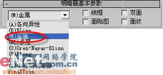 1、點(diǎn)擊工具欄上的“材質(zhì)編輯器”按鈕,打開其面板,選擇第一個(gè)樣球,打開“明暗器基本參數(shù)”卷展欄,在下拉列表中選擇“金屬”項(xiàng),如圖3所示。
