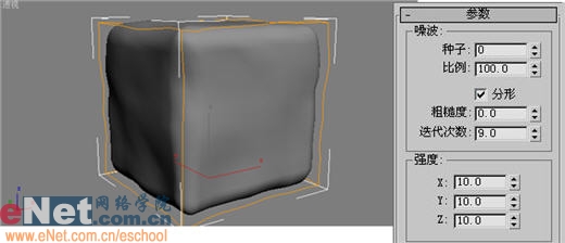 2、選中chamferbox01,單擊“修改”命令面板,在“修改器列表”下拉框中選擇“噪波”項(xiàng)進(jìn)入其屬性面板,修改其參數(shù),如圖2所示。