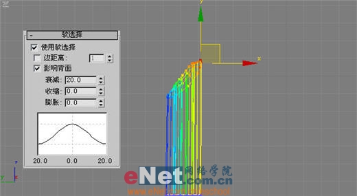 5、繼續在“修改”面板中操作,在“修改器列表”中選擇“編輯網格”項,打開“選擇”卷展欄,單擊“頂點”按鈕,打開“軟選擇”卷展欄,修改其參數,框選頂端面的頂點,將其拖拽成刀削樣子,如圖5所示。