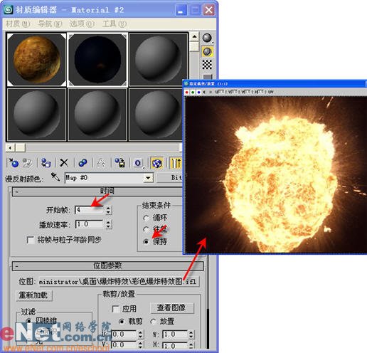 3、選擇第二個(gè)樣球,點(diǎn)擊“漫反射”后面的none按鈕,為它指定一彩色爆炸效果時(shí)序圖,并調(diào)整它出現(xiàn)的時(shí)間在第4幀左右,如圖10所示。