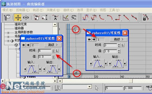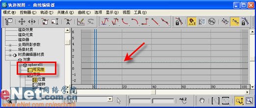 5、點(diǎn)擊工具欄上的“曲線編輯器”按鈕,打開(kāi)軌跡視圖,確定到sphere01上,點(diǎn)擊“軌跡”菜單中的“可見(jiàn)性軌跡 添加”命令,并通過(guò)放大按鈕可以看到可見(jiàn)性值為1,如圖5所示。