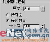3、并點(diǎn)擊“視口顯示”欄下的“網(wǎng)格”項(xiàng),并確定“粒子數(shù)百分比”為100%,在“粒子類型”卷展欄下,選擇“對(duì)象碎片”單選框,接著在“對(duì)象碎片控制”欄下確定“厚度”值為5,“碎片數(shù)目”為200。如圖3所示。