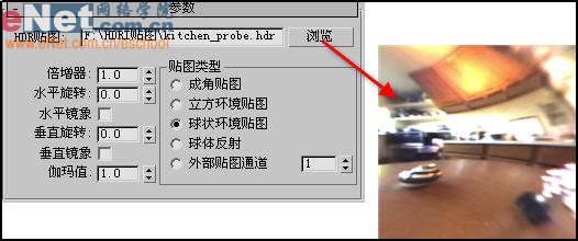 6、點擊“渲染”菜單中的“環境”命令,單擊背景欄中的無按鈕,為其添置一vrayhdri貼圖,并打開材質編輯器,將該材質拖拽到一未使用樣球上釋放,從而打開了hdr貼圖參數欄,單擊瀏覽按鈕,為它指定一事先準備好的貼圖,如圖11所示。