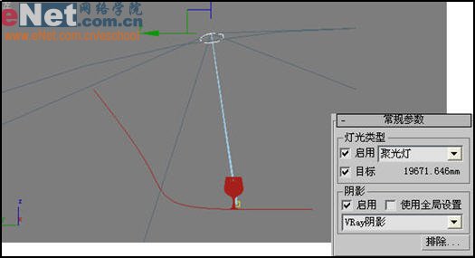 6、單擊“創建”命令面板中的“燈光”按鈕,在創建面板中選擇“目標聚光燈”按鈕,在視圖中拖拽出一盞燈光spot01,調整其照射位置,并啟用“常規參數”卷展欄中的“陰影”為“vray陰影”,如圖7所示。