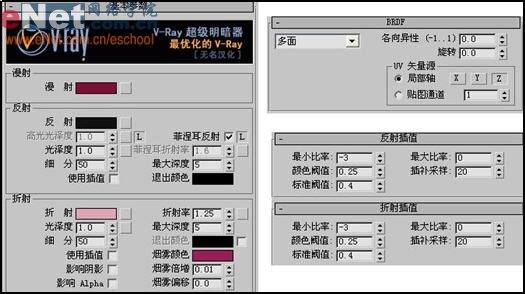 1、點擊工具欄上的“材質編輯器”按鈕,打開其面板,選擇第一個樣球,點擊“standard”按鈕,在打開的“材質/貼圖瀏覽器”面板中,雙擊右欄中的“vraymtl”項,并進入其屬性面板,修改相關值,如圖8所示。