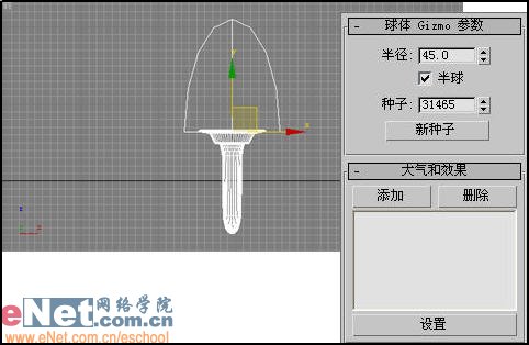 2、選中spheregizmo01,點擊“修改”命令面板,修改其半徑值,勾選半球、拉伸其高度,并將其放置在火炬的上部,修改后的效果如圖4所示。