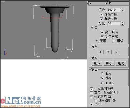 2、選中line01,單擊“修改”命令面板,在“修改器列表”下拉框中選擇“車削”項進入其屬性面板修改相關參數,得到的效果如圖2所示。