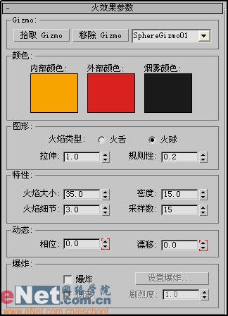 小提示:顏色欄中用于設置火焰的顏色,從左到右依次為“內焰”、“外焰”、“煙”的顏色;“圖形”欄中的“火焰類型”用來確定不同方向和形態的火焰;“拉伸”用于產生細長的火苗;“規則性”用于設定線框(gizmo)內的填充情況;“特性”欄中用于設定火焰的尺寸和密度等相關參數;“動態”欄用于設定火焰動畫的相關參數,“相位”表示火焰變化速度;“漂移”表示火苗的升騰快慢。