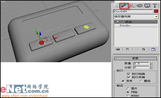9、點擊“圖形”創建命令面板中的“圓”按鈕,在頂部視圖中繪制一圓circle01,并通過“修改”面板,為它添加一“擠出”修改器,做出按鍵上的觸點效果,如圖8所示。
