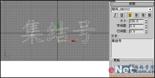1、啟動3dmax9.0,單擊“創建”命令面板,點擊“圖形”創建面板,點擊“文本”按鈕。在前視圖中繪制一文字text01,并適當調整其大小等參數,如圖1所示。