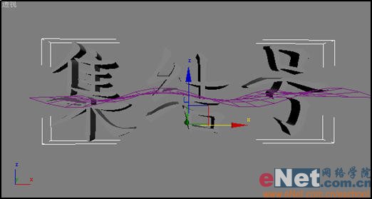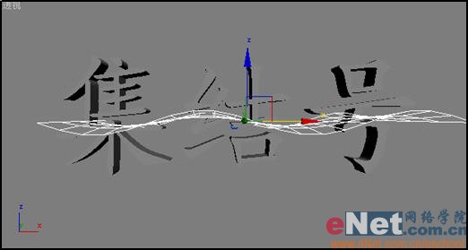 4、選中text01,單擊工具欄上的“綁定到空間扭曲”按鈕,然后選擇視圖中的wave01,此時文字就產生了波浪起伏的效果,如圖4所示。