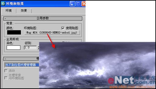 2、點擊“渲染”菜單中的“環境”命令,打開其窗口,啟用環境貼圖,并為其指定一天空圖片,如圖8所示。