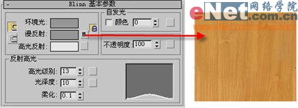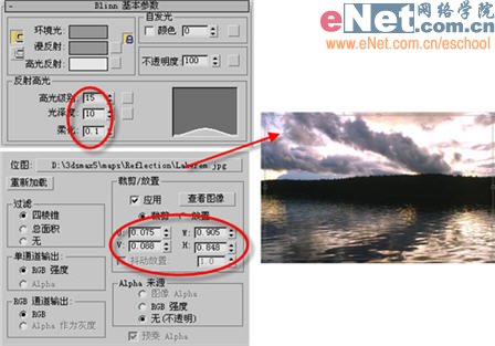 3、選擇第二個(gè)樣球,打開“blinn基本參數(shù)”卷展欄,調(diào)整反射高光欄下的各項(xiàng)值,打開“貼圖”卷展欄,為“反射”增添一貼圖,為它指定一鋼制反射材質(zhì),并適當(dāng)調(diào)整其位置大小,如圖7所示。