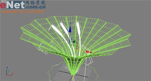 6、以circle01為截面,線條line02為路徑進(jìn)行放樣,方法同步驟2,產(chǎn)生放樣物體loft02,同樣打開(kāi)其“變形”卷展欄,單擊“縮放”按鈕,在彈出的面板中修改其曲線,并調(diào)整其到花的中央位置,作為花蕊,效果如圖6所示。