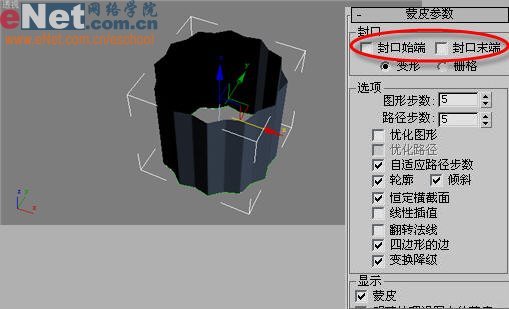 3、選中l(wèi)oft01,單擊“修改”命令面板,展開(kāi)“蒙皮參數(shù)”卷展欄,去掉放養(yǎng)物體上下端的封蓋,如圖3所示。