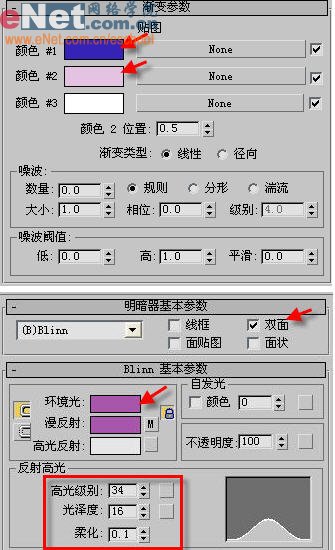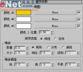 小提示:顏色1、顏色2、顏色3分別設(shè)定為三種漸變顏色,也可通過(guò)“none”按鈕進(jìn)行設(shè)定貼圖;顏色2位置值用于設(shè)置顏色2的位置,當(dāng)值為1時(shí)顏色2在最上層,整個(gè)貼圖相當(dāng)于是顏色2與顏色3的漸變貼圖,反之,當(dāng)值為0時(shí)相當(dāng)于顏色1與顏色2的漸變貼圖;漸變類(lèi)型用于設(shè)置時(shí)按線性或徑向方式進(jìn)行漸變。