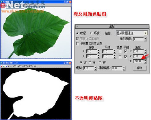 5、選擇第四個(gè)樣球,勾選“明暗器基本參數(shù)”卷展欄中的“雙面”項(xiàng),打開(kāi)“貼圖”卷展欄,為“滿反射顏色”、“不透明度”各指定一位圖,并適當(dāng)調(diào)整其坐標(biāo)角度,最終將材質(zhì)賦予plane01,如圖13所示。
